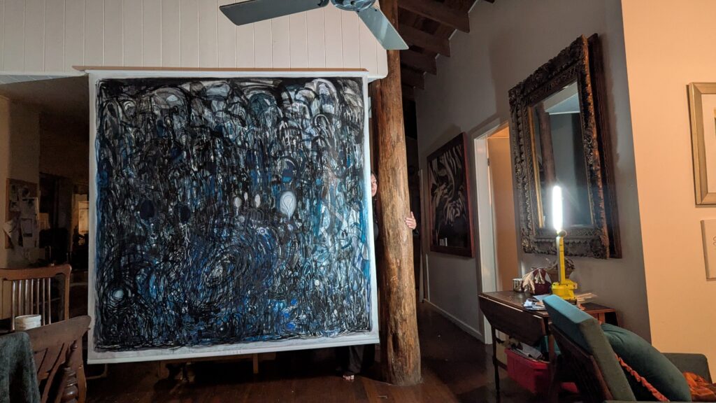I can’t complain about a lack of space to make art. I’m fortunate to live on the banks of a river with my family, surrounded by nature. Occasionally a goanna runs past when I’m working outside, a python slithers along the rafters of the verandah, a platypus floats in the water below, or a catbird pierces the air with its eerie call.