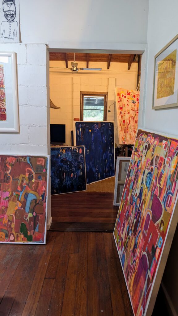 I don’t have a studio in the conventional sense. It is wherever the work happens to be that day or week -whatever is convenient, whatever suits. Sometimes it’s the vintage caravan, sometimes the loungeroom, the entry foyer, the verandah, or the front yard.